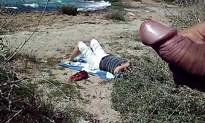 horny fellow masturbates at the beach while horny damsel watches him
