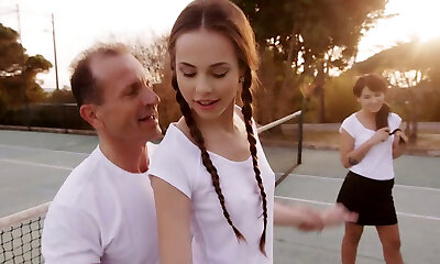 frech trainer bohrt duo von stellaren schlanken mädchen nach ultra-niedlichen tennis-spiel