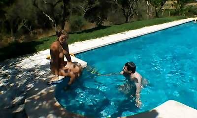 Blonde babe with small tits gets hardcore fuck activity with older srud by the pool